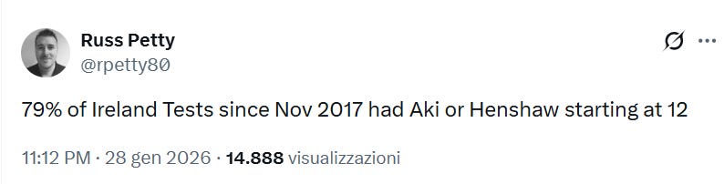 Hugo Keenan è un altro giocatore infortunato, per cui l’Irlanda si troverà a giocare a estremo con uno fra Ciaran Frawley e Jamie Osborne.