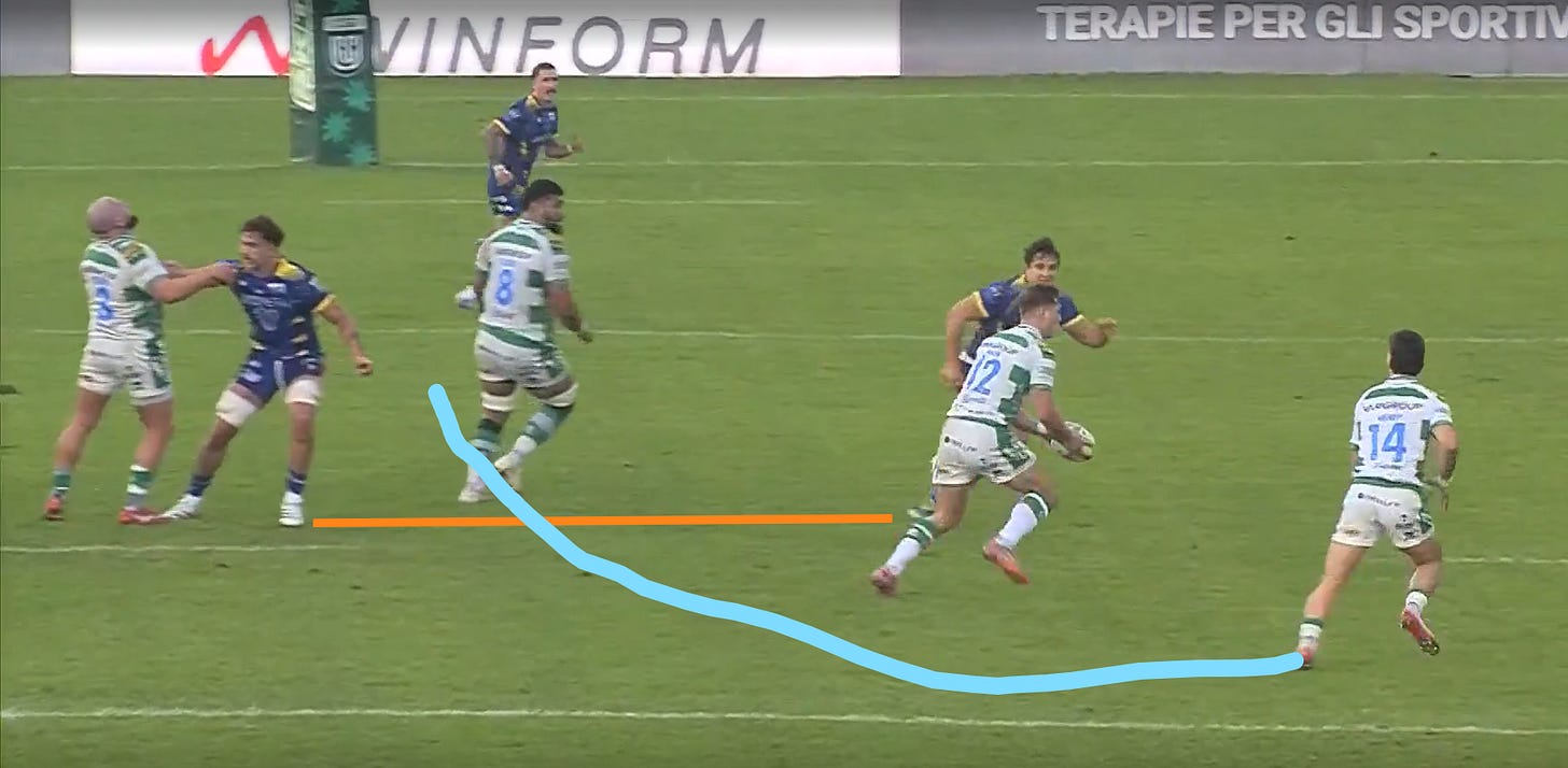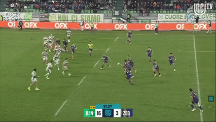 Proprio da una transizione arriva la prima meta dell’incontro: Matt Gallagher raccoglie un calcio avversario poco dentro la metà campo avversaria, il Benetton entra molto velocemente nella propria struttura offensiva e trova la meta grazie a una penetrazione eccezionale di Manuel Zuliani, seguita da uno slalom di Ignacio Mendy, bravo a trovare spazio in una difesa delle Zebre che non continua a lavorare dall’interno.