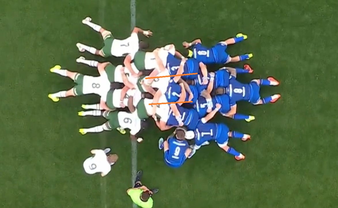 Normalmente le prime linee tendono a cercare un angolo di spinta verso destra: questo permette loro di andare dritti e di impedire agli avversari di proteggersi dalla spinta del diretto avversario. Il Sudafrica, invece, punta a un ingaggio forte e rapido verso sinistra, per mettere in difficoltà il pilone destro e poi tornare a spingere verso destra.